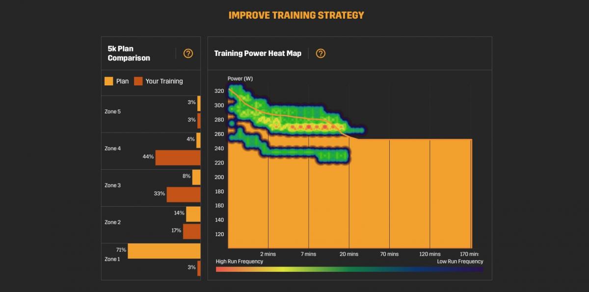 Probably the most interesting of the lot is the training power heat map. This is a visual description of your running history in terms of power and duration. It overlays info from all your runs on top of each other, providing you with a map of what you are able to achieve in terms of power, duration, and frequency. This essentially gives you a very good idea what you can achieve in race conditions. Stats lovers will feel right at home.