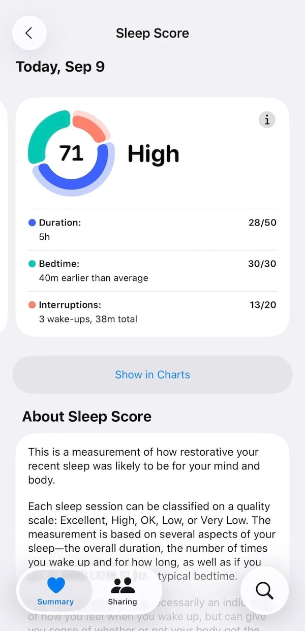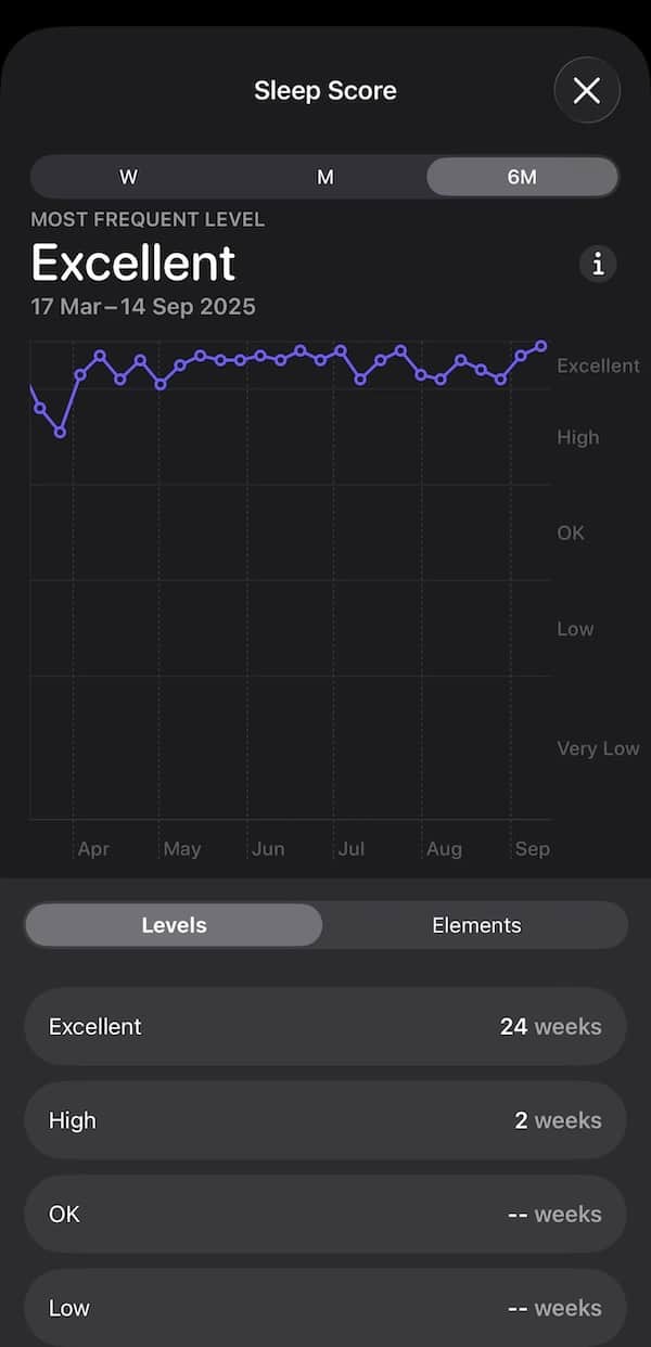 This includes people who track sleep using third-party devices. As long as your wearable pushes sleep stages and duration into Apple Health, the score appears. It doesn’t matter if you have an Apple Watch, Garmin, Withings or another brand’s wearable.