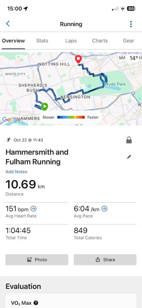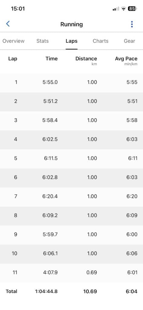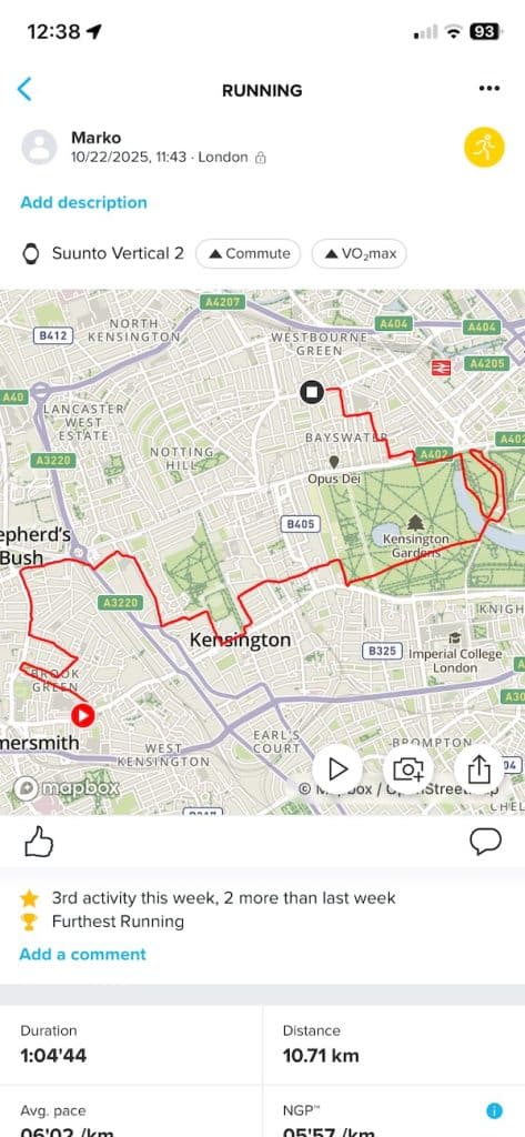 On a run through central London, Suunto logged 10.71 km while Garmin came in at 10.69 km. That route included tight corners, frequent direction changes and tall buildings, yet both watches stayed locked on with minimal drift. On another run, they both recorded exactly 7.56 km. Even on a third test, the difference was just a single metre.
