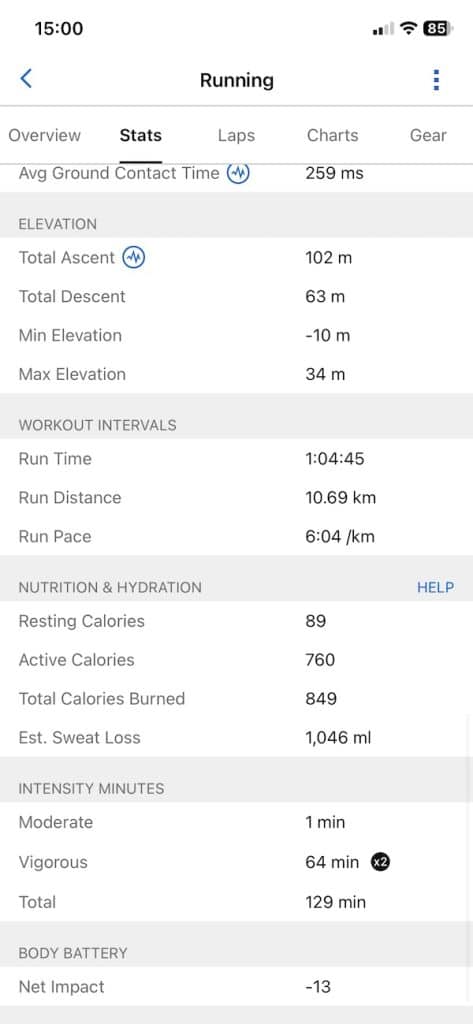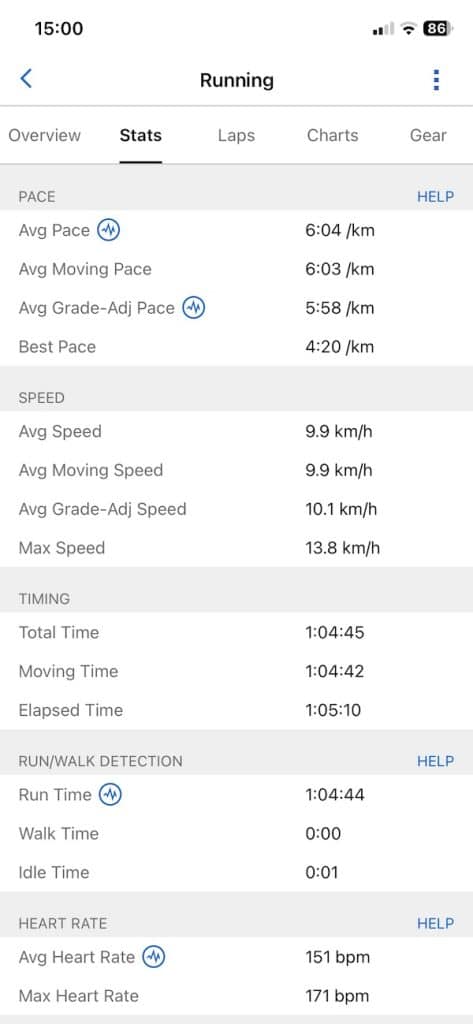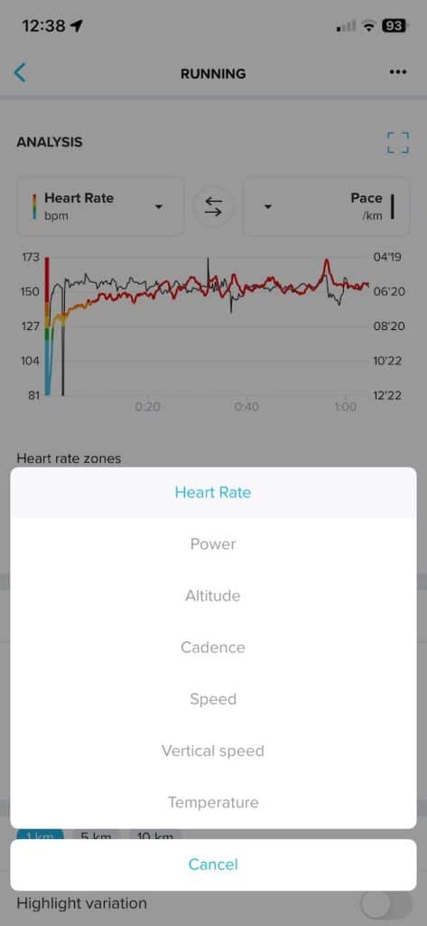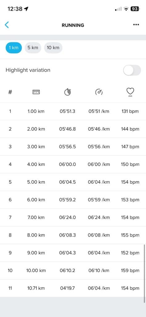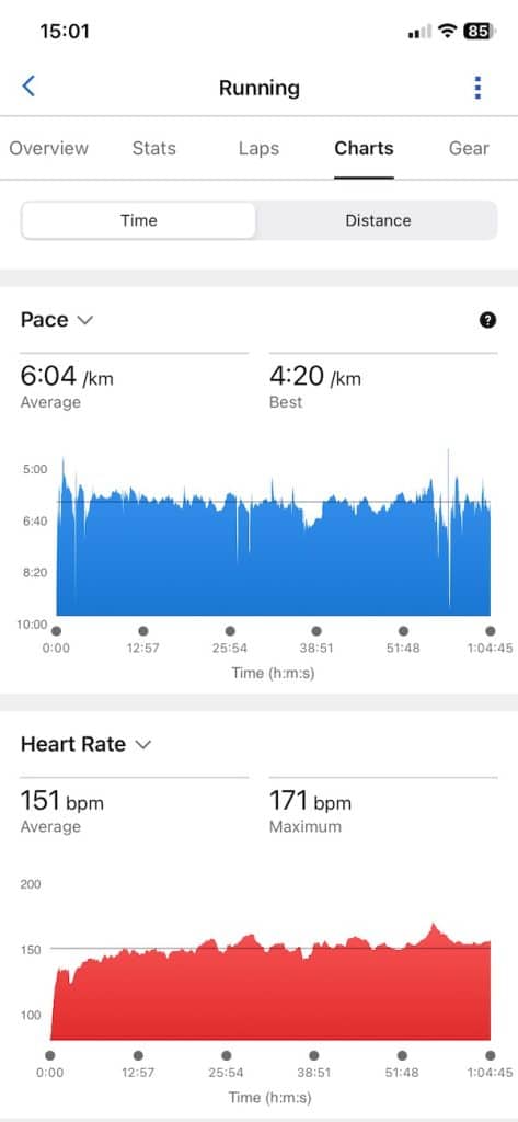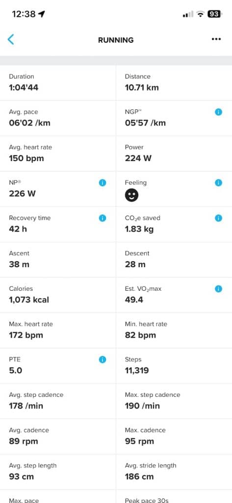 On side-by-side screenshots from the 10.7K run, the Suunto app presents heart rate, pace, cadence, and power graphs that closely match Garmin’s metrics. Garmin does offer a bit more in terms of running metrics, but the difference is not huge.
