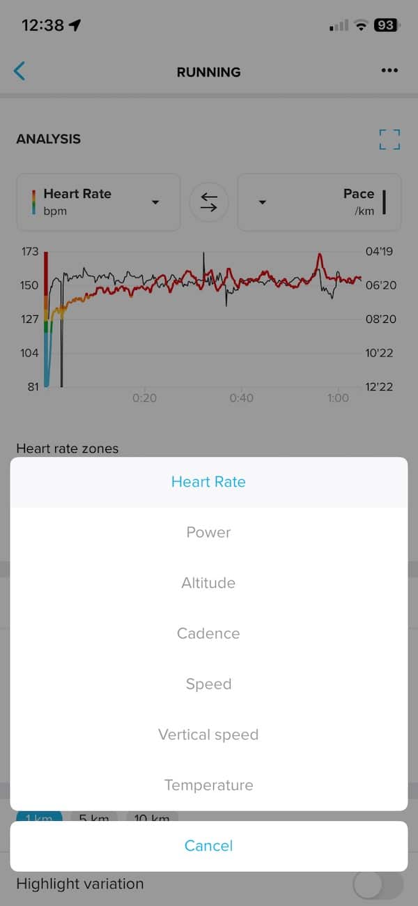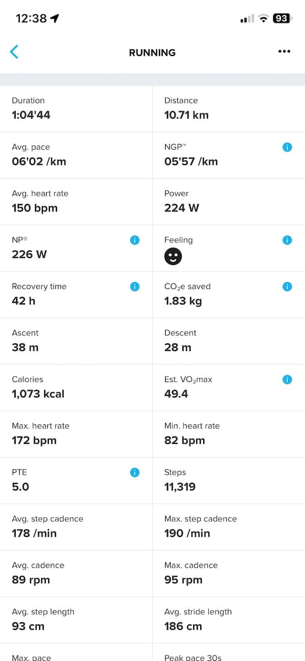 On side-by-side screenshots from the 10.7K run, the Suunto app presents heart rate, pace, cadence, and power graphs that closely match Garmin’s metrics. Garmin does offer a bit more in terms of running metrics, but the difference is not huge.