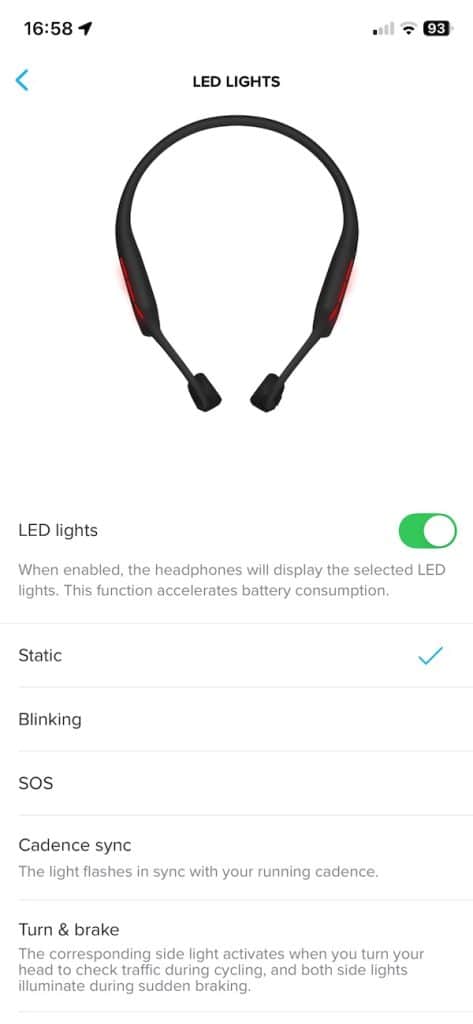 A nice touch is the set of LED lights. You don’t see them when you’re wearing the headphones, but they’re there. You can keep them steady, set them to blink, or have them pulse in time with your steps. It’s a simple way to boost visibility when it’s dark out.