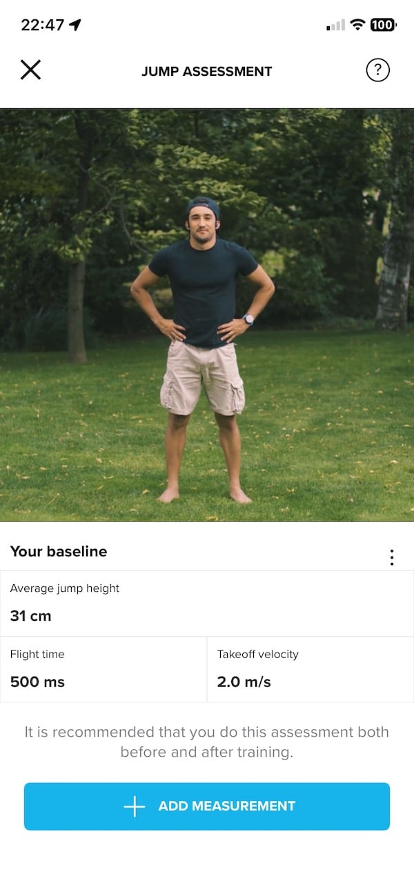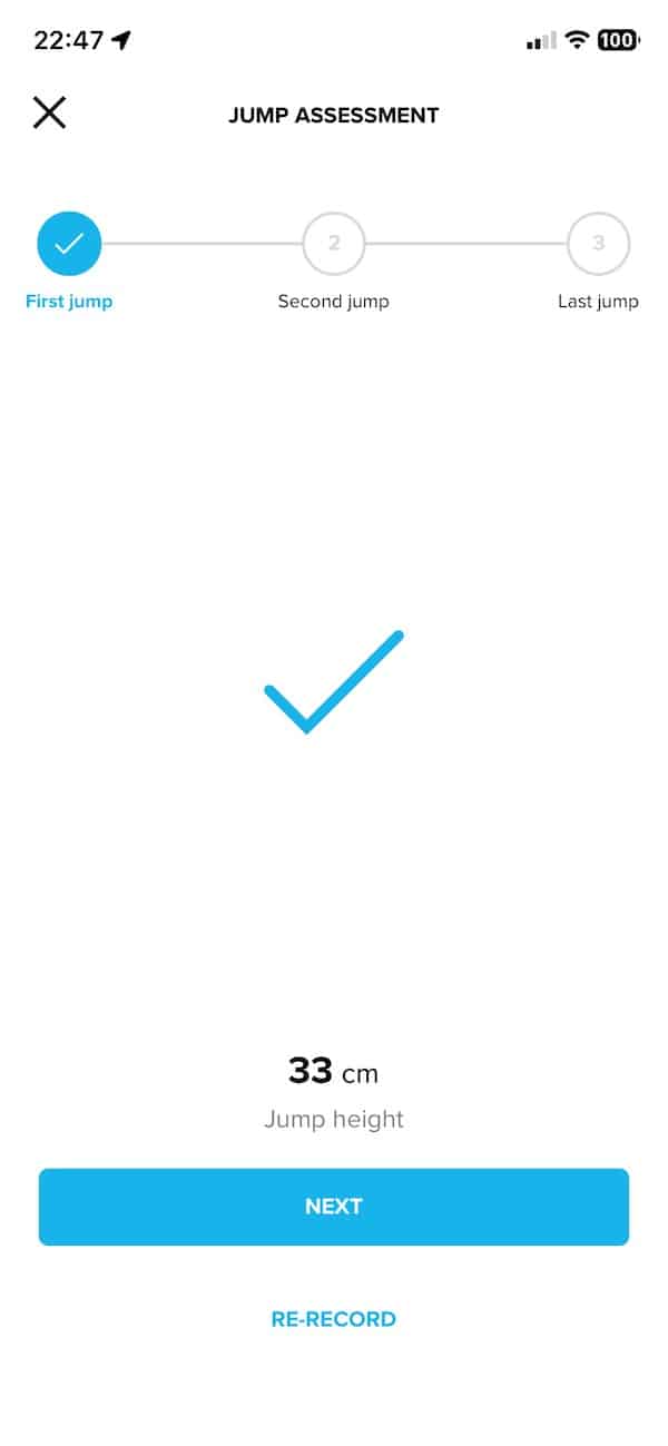 You’re meant to do the test before and after training to see how your numbers shift. If one of your jumps seems off, you can re-do it before saving the final result. Once saved, the system uses this to track how fresh or tired your legs are on future workouts.