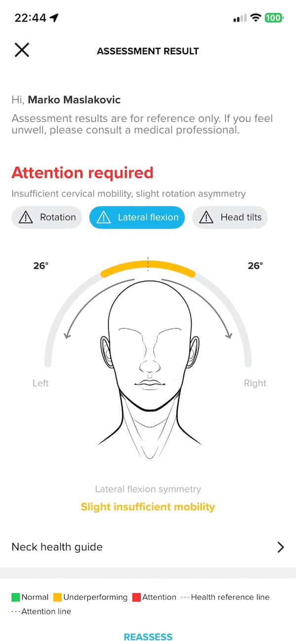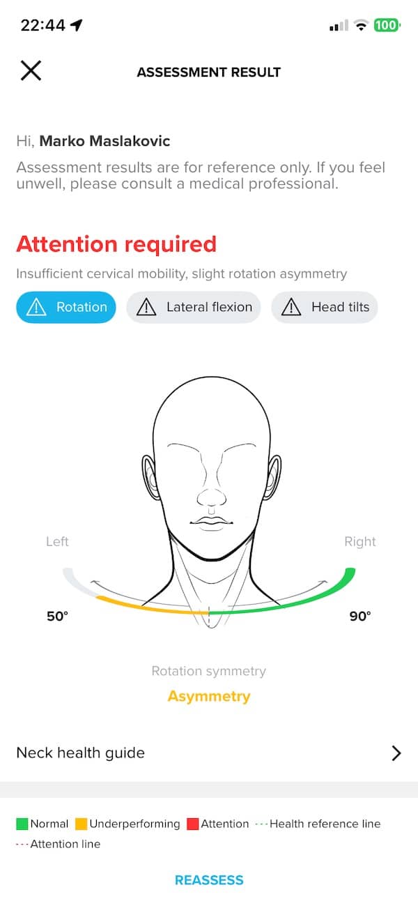 The first of these gives an assessment of your cervical spine flexibility or, put more simply, how stiff your neck is. As directed by the test, you just move your head side to side, up and down while wearing the headset – and it tracks how far you can go in each direction.