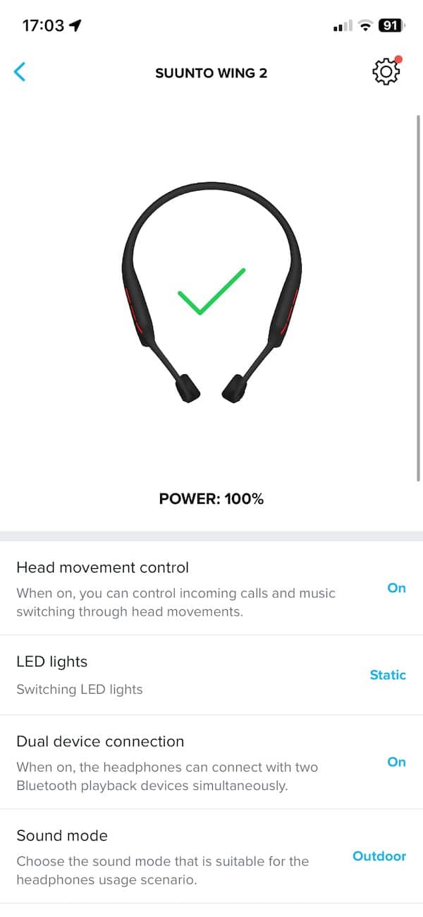 The headset connects via Bluetooth to your phone or a Suunto watch. Once paired, it’ll reconnect automatically each time you turn it on. You can use it for music, calls or get voice feedback during workouts if you’re using a supported Suunto model. I paired it with my Vertical 2 watch.