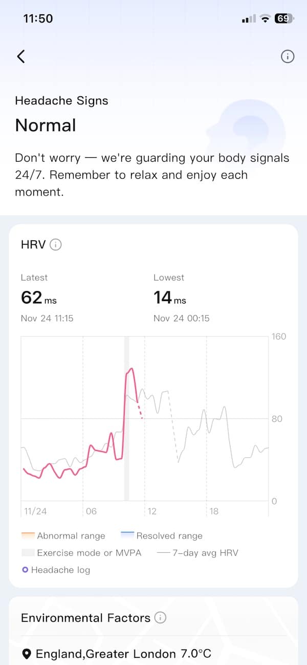One of these early warning systems is Headache Signs. It looks at your vital signs and cross-references them with changes in local air pressure. If it detects a possible barometric headache brewing, you’ll get a heads-up. That’s useful if you’re someone who tends to get hit by migraines when the weather shifts. It’s also a clever way to make the ring feel more connected to your surroundings, not just your internal metrics.