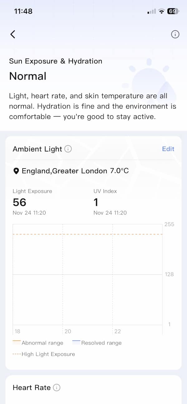 Another addition to the Health Alerts system is a feature that combines sun exposure with hydration status. Since smart rings don’t have a sensor that can directly detect water intake, RingConn takes a different route. It checks if you’ve been in strong sunlight for a while, and looks at changes in heart rate or skin temperature that might indicate early heat stress.