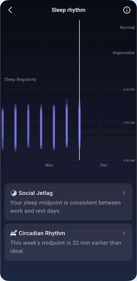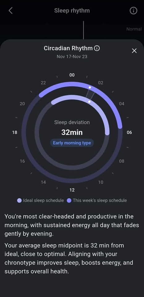 Beyond social jetlag, the update adds another layer: Circadian Rhythm tracking. This section attempts to categorize your chronotype by looking at your natural tendencies. Whether you’re an early riser, night owl, or somewhere in between, the app now labels it and tracks how far your current schedule deviates from that ideal.