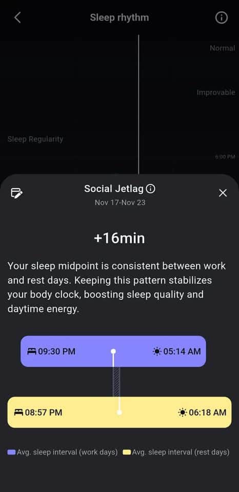 First up is the Social Jet Lag score. The concept refers to how far your weekend routine drifts from your weekday schedule. The app calculates your midpoint of sleep, halfway between falling asleep and waking up, on both work and rest days.