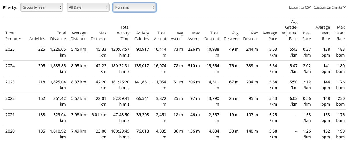 The feature provides lots of data, allowing you to easily check your summary stats. Here’s a yearly overview of my running activity. Scroll left-right to navigate through the various statistics.