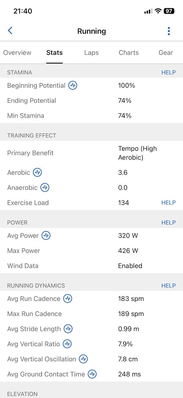 As far as other stats, you get quite a bit. This includes pace, elevation changes, stride length, cadence, running power and Training Effect. VO2Max is also there, but for some reason after three runs I did not give me a value. Perhaps it takes a few more runs before it spits out an estimate.