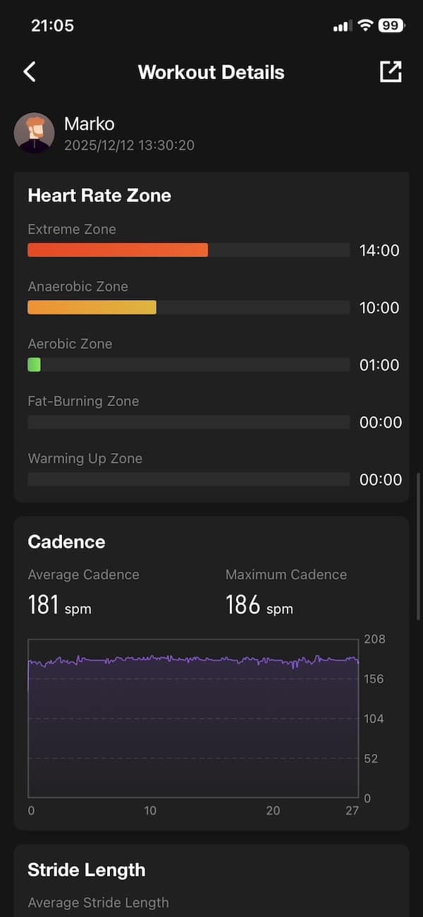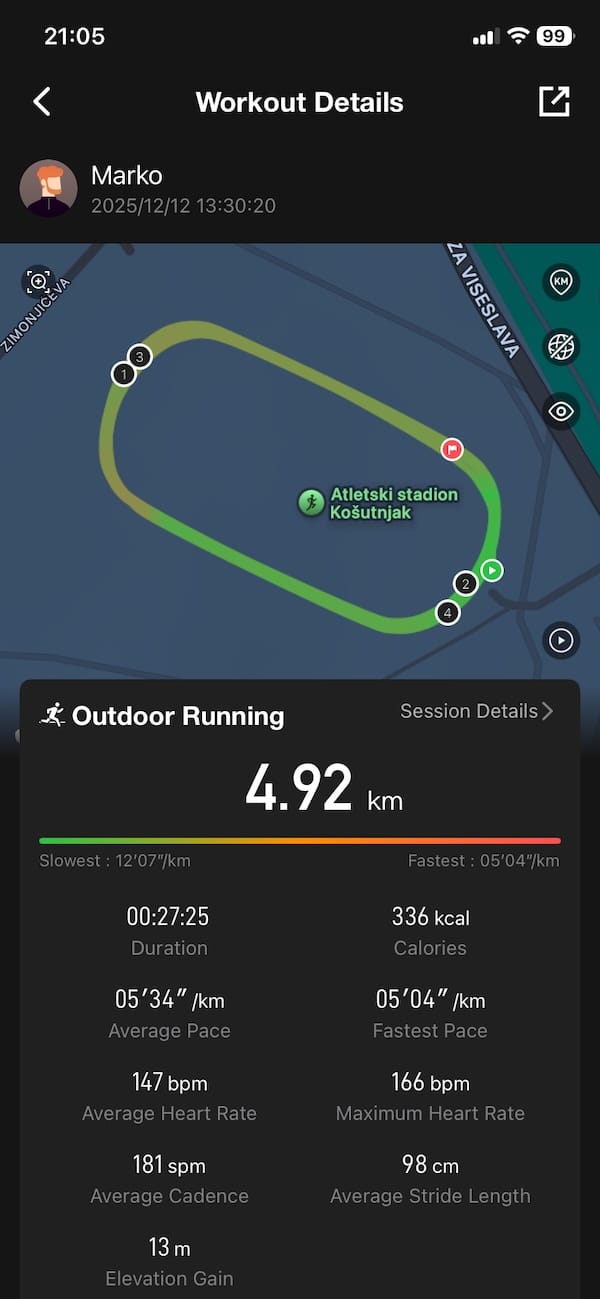Heart rate accuracy was a bit hit and miss at first. On the two 7.5 km runs, the Tank T4 showed spiking heart rate values in the first 30 seconds to a minute. After that, things would settle down and the readings matched the Garmin closely. But those early spikes can mess with your average and zone stats, especially if you’re using the data for structured training. I think part of the issue comes down to the weight of the watch. On small wrists like mine, it can shift during the first few strides and throw off the sensor.