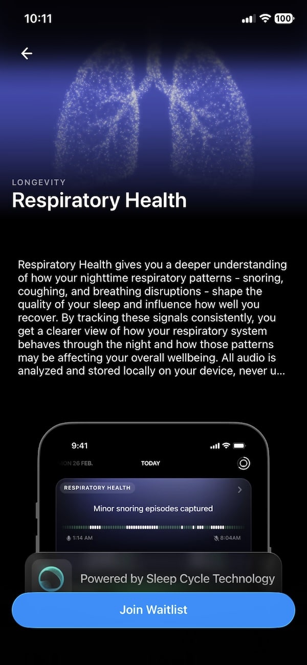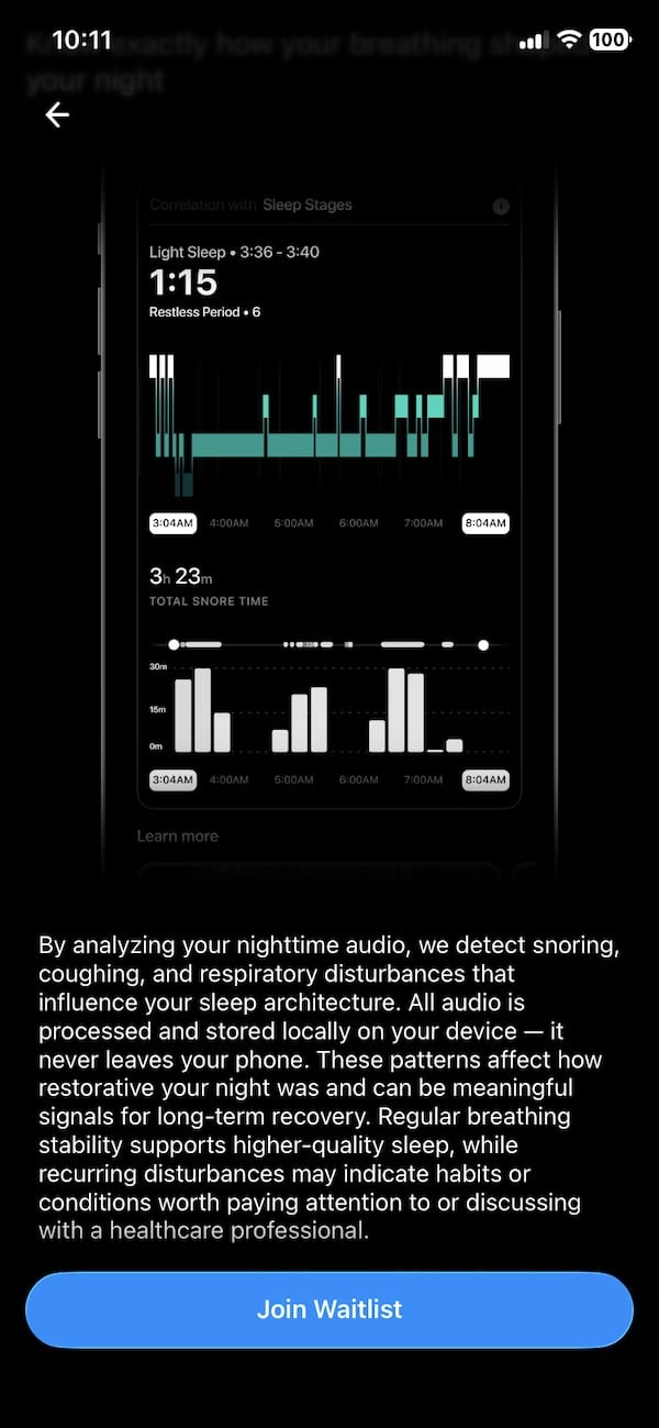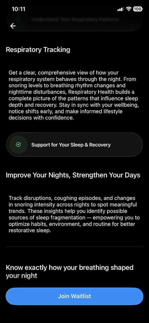 Respiratory Health offers users a closer look at sleep-related breathing patterns. It monitors the presence and frequency of snoring, changes in respiratory rhythm, coughing episodes and other disturbances. The idea is to build a clearer picture of how these patterns affect overall sleep quality, restfulness and recovery.