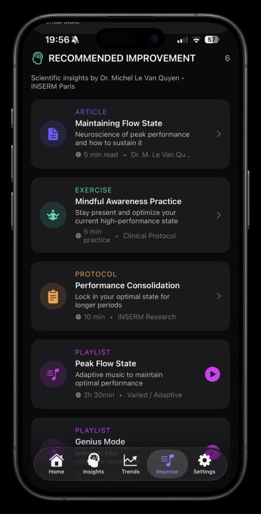 The system also tries to close the loop between insight and action. Based on what it sees, the platform suggests breathing exercises and music playlists, alongside short educational pieces about performance and mental wellbeing. This content has been developed with input from neuroscience specialists, but it is presented in a way that feels light and usable rather than clinical.