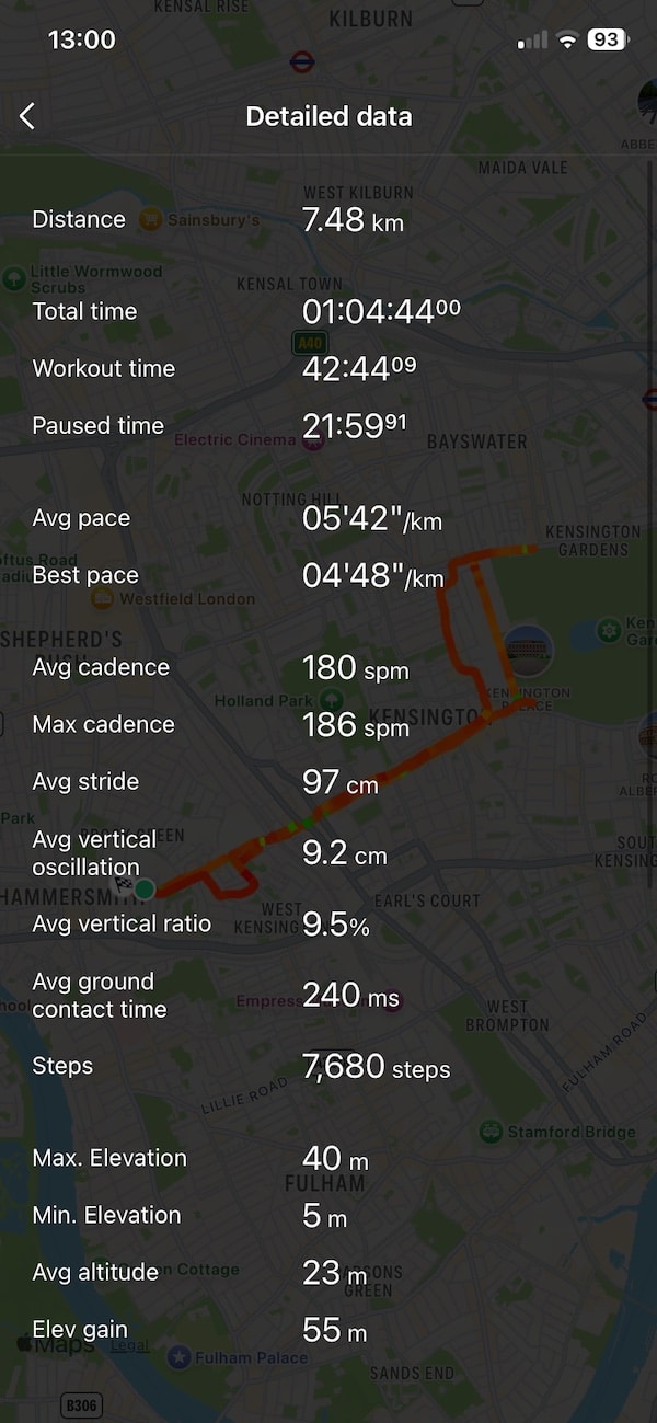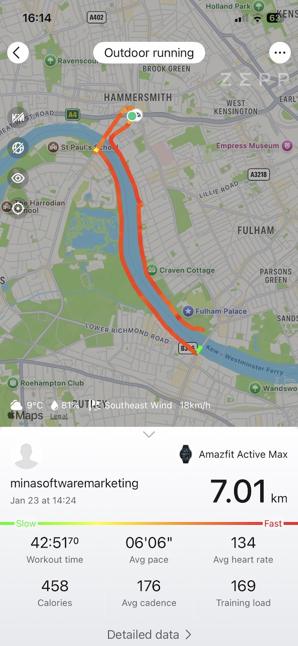 I wanted to see how the Amazfit Active Max holds up against a watch I know well, a Garmin Forerunner. Rather than relying on specs or lab tests, I wore both on the same 7.5 km run through central London to see how they recorded and interpreted the session.