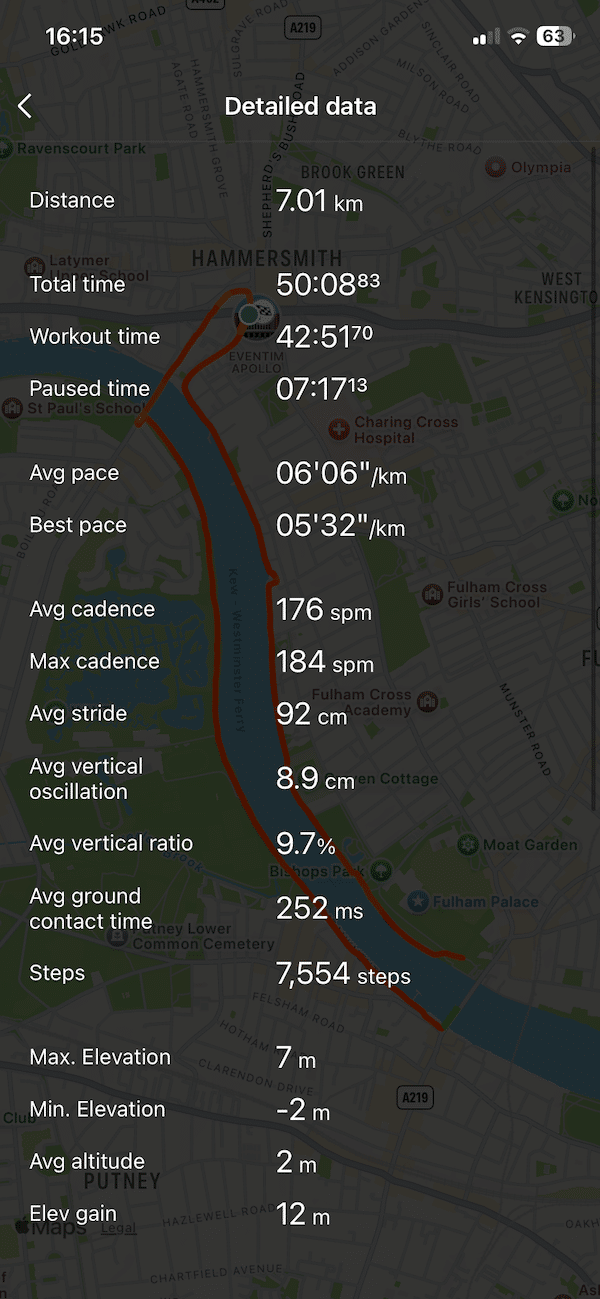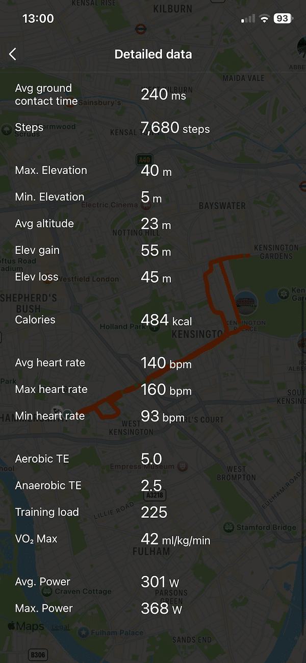 Granted there was a difference for HRmax, but this was an outlier. On my other runs the max heart rate difference was typically within 1-3 beats. A subsequent Zone 2 7K run in Central London showed pretty much identical GPS tracking and only a 1 bpm difference in average and maximum heart rate as shown in the screenshots below.