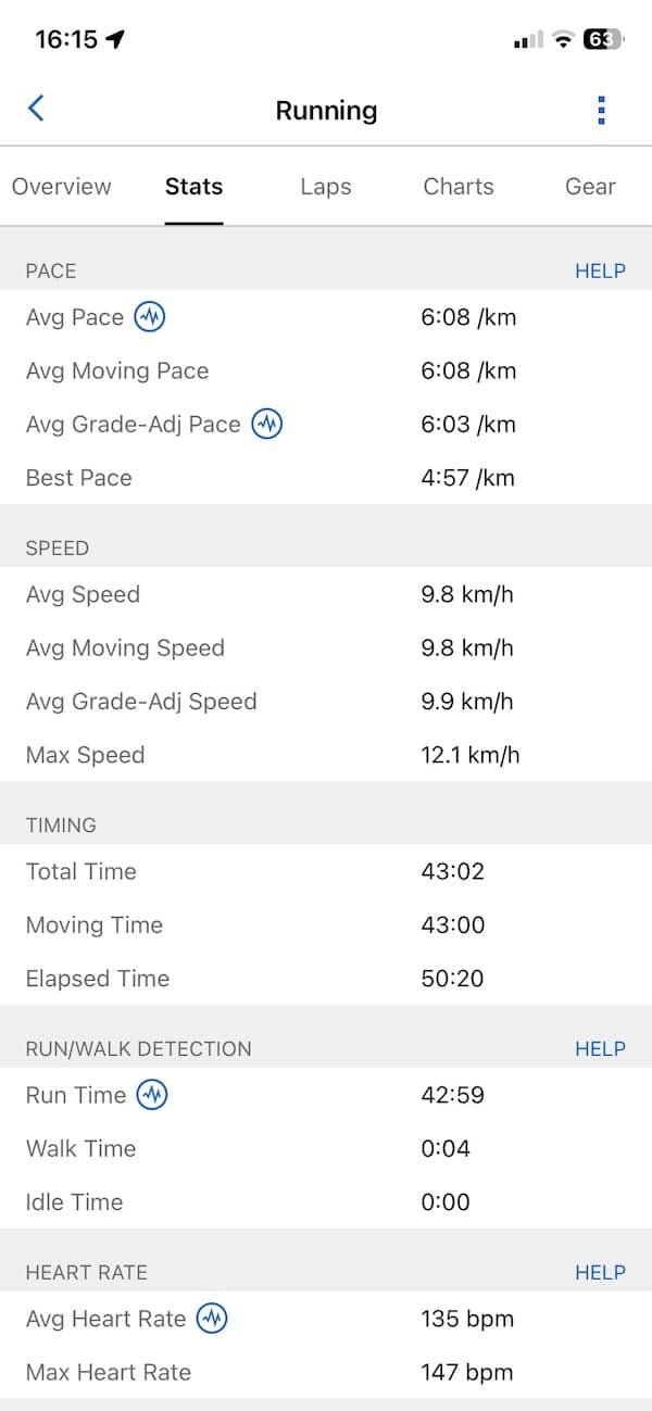 Stride length was effectively the same. Amazfit showed 97 cm and Garmin rounded that to 1 metre. That tells me both watches are broadly aligned on forward motion.