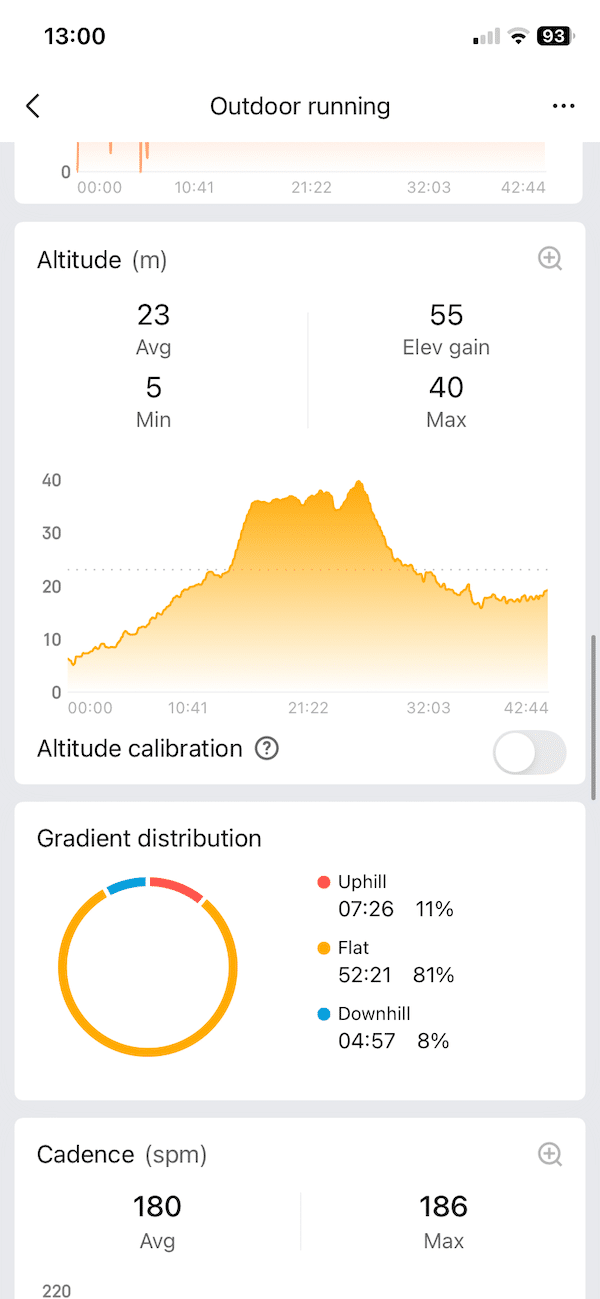 Cadence was close but not identical. Amazfit reported 180 spm on average while Garmin came in at 176 spm. I have seen this pattern before. Amazfit tends to sit a little higher on cadence, especially when pace fluctuates.