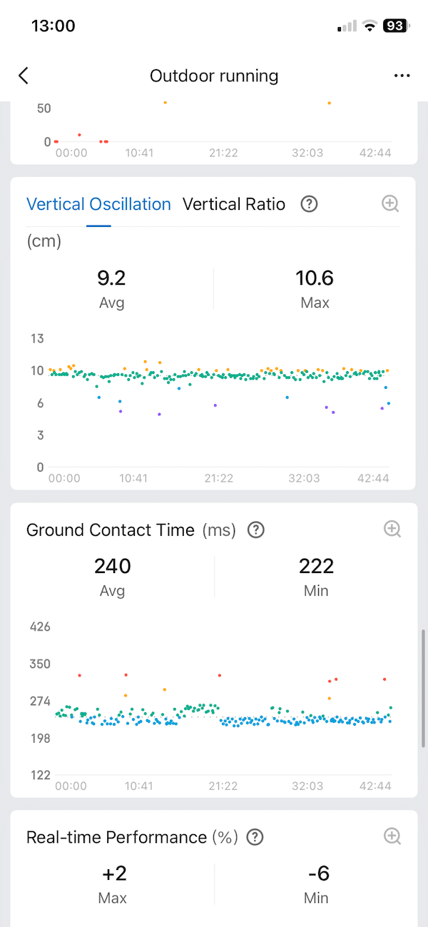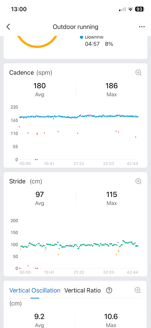 Vertical movement is where the numbers drifted further apart. Amazfit reported higher vertical oscillation and a higher vertical ratio. Garmin showed lower values for both, suggesting a more conservative view of bounce and efficiency. I tend to trust Garmin more here, based on long term consistency across different runs and shoes.