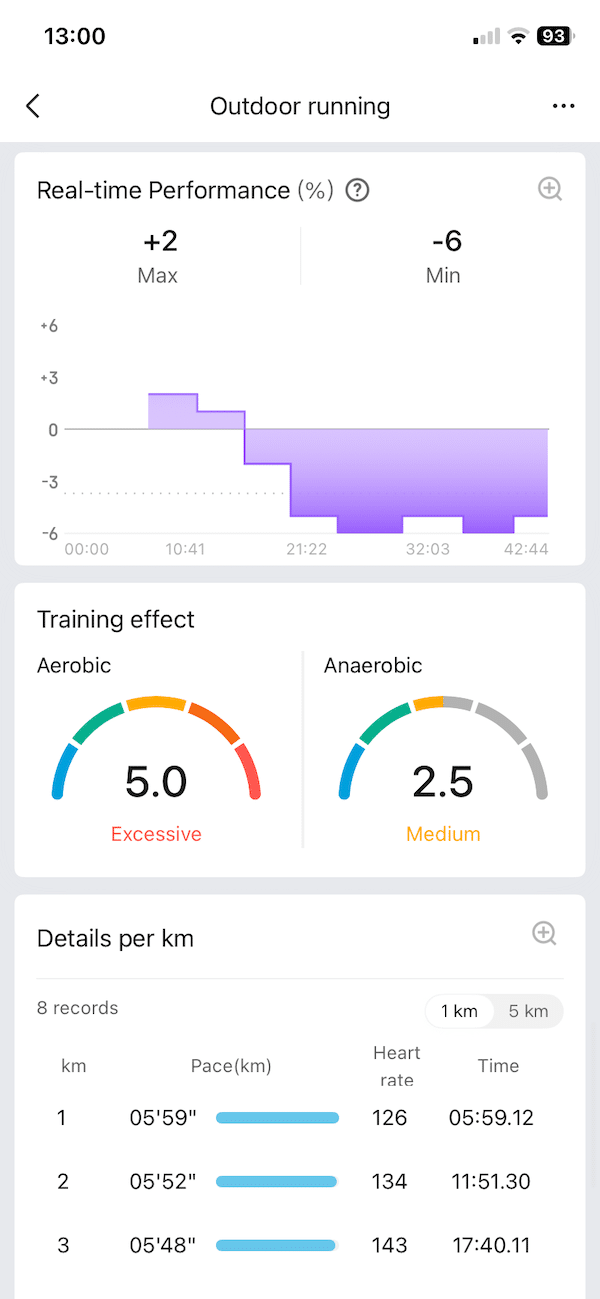The Amazfit estimated my maximum heart rate from which it calculated the HR zones at 164 bpm, while Garmin pegged my max at 174 bpm. I have used the Garmin for years so it had time to estimate more accurately this metric. You can’t edit the Amazfit metric directly, but over time the max HR would have adjusted gradually. Which in turn would have eliminated this difference in training load.