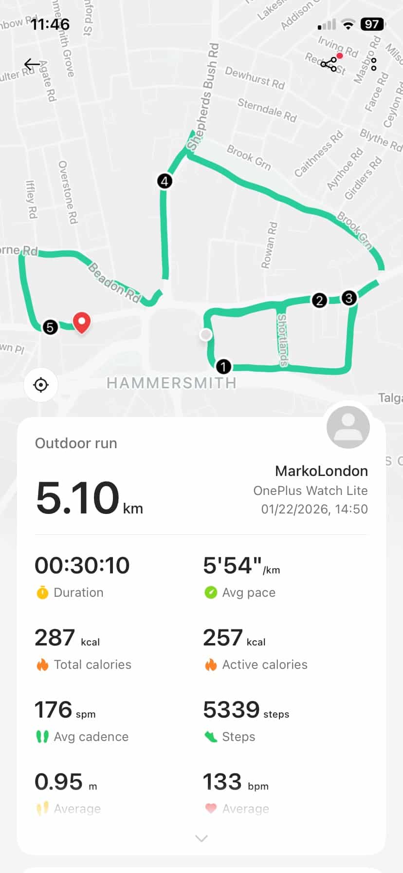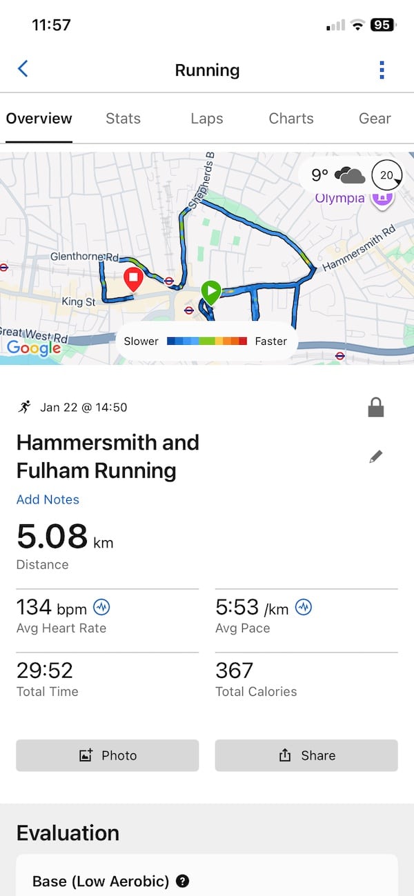 GPS performance has been solid, even in Central London. It locks on quickly before a session, and once connected, the signal stays stable even in tougher spots like tree cover or around tall buildings. The dual-band satellite support definitely helps here, and I’ve seen similar performance to the Watch 3 models. That part feels consistent across the lineup.