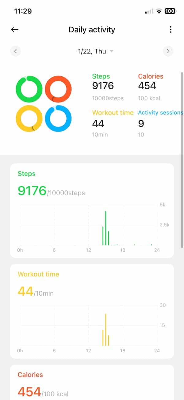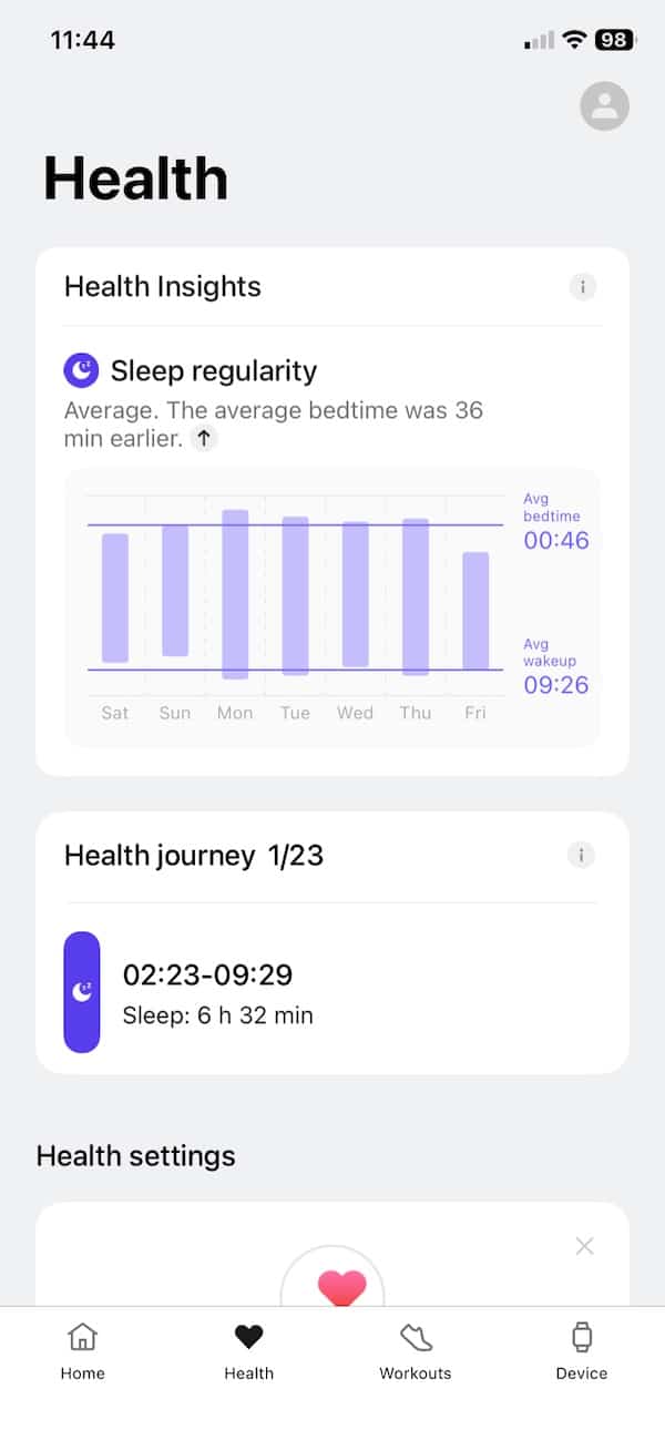 The sleep tracking breaks things down into light, deep and REM stages, plus overall sleep time and trends. It’s basic but useful, especially if you just want a quick read in the morning without getting lost in graphs. Heart rate tracking felt accurate most of the time, though it’s a little slower to respond when your heart rate spikes quickly. Not a huge issue unless you’re constantly jumping between states, and for general wellness tracking, it’s solid.