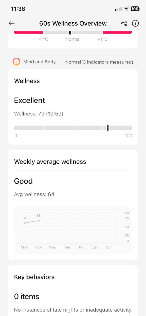 Also worth mentioning is the 60 second wellness checkup, which spits out some novel things. For example, arterial stiffness and vascular age. Both are indicators of the elasticity of your blood vessels.