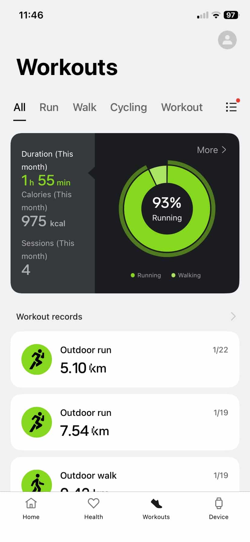 The watch displays core stats like time, distance, pace and heart rate live during workouts, and you can view your route and summary data afterward in the OHealth app. It’s not loaded with training tools or deep analysis, and you won’t find third-party sync support, but for straightforward workout logging, it does the job.