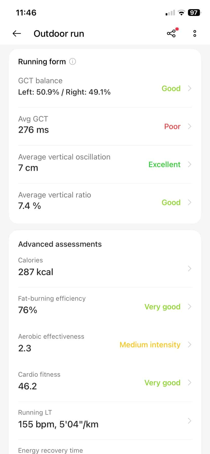 You even get things such as running form metrics, but for some reason I could not find a VO2 estimate. Not sure if it is hidden away somewhere or is yet to be added to the app.