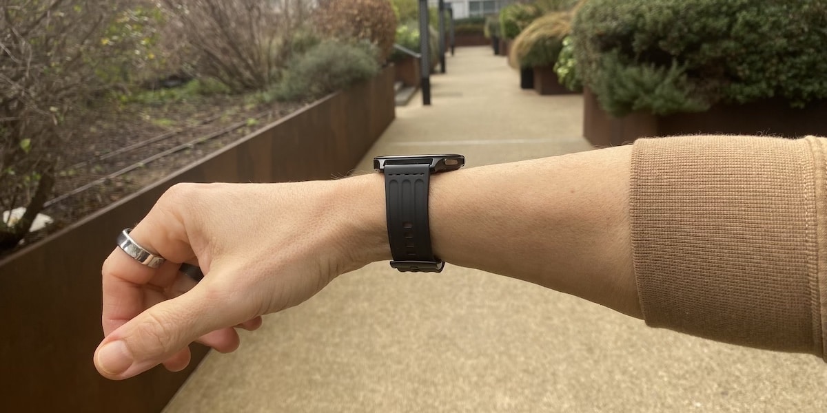 The drop in thickness and weight makes a real difference in everyday wear. The device sits flatter on the wrist, slips under a sleeve without catching, and just disappears more easily during the day. The fluoroelastomer strap feels soft and doesn’t cause any irritation, even after long hours. The whole thing wears more like a fitness band than a full-on smartwatch, but without looking cheap or plasticky. Quite the contrary.
