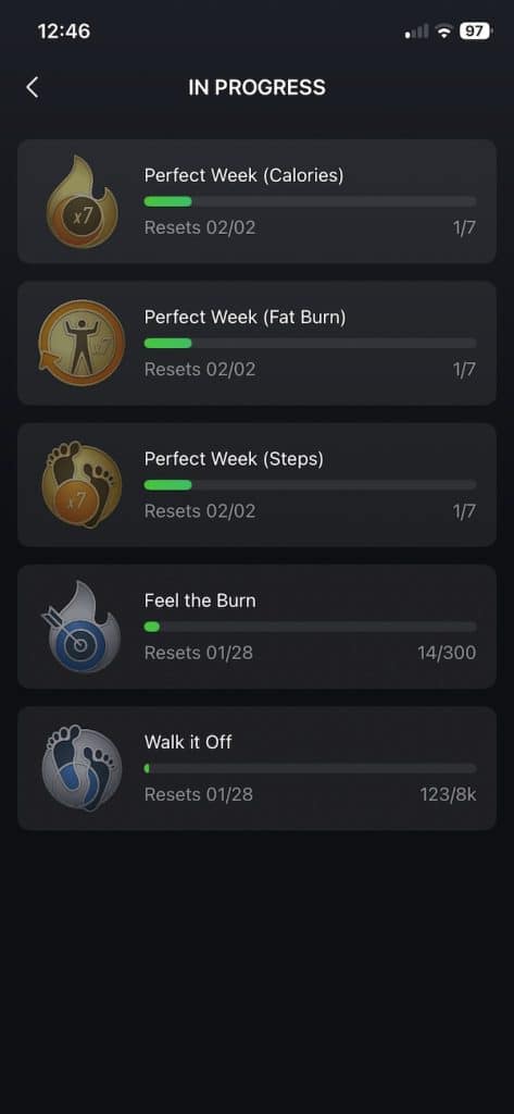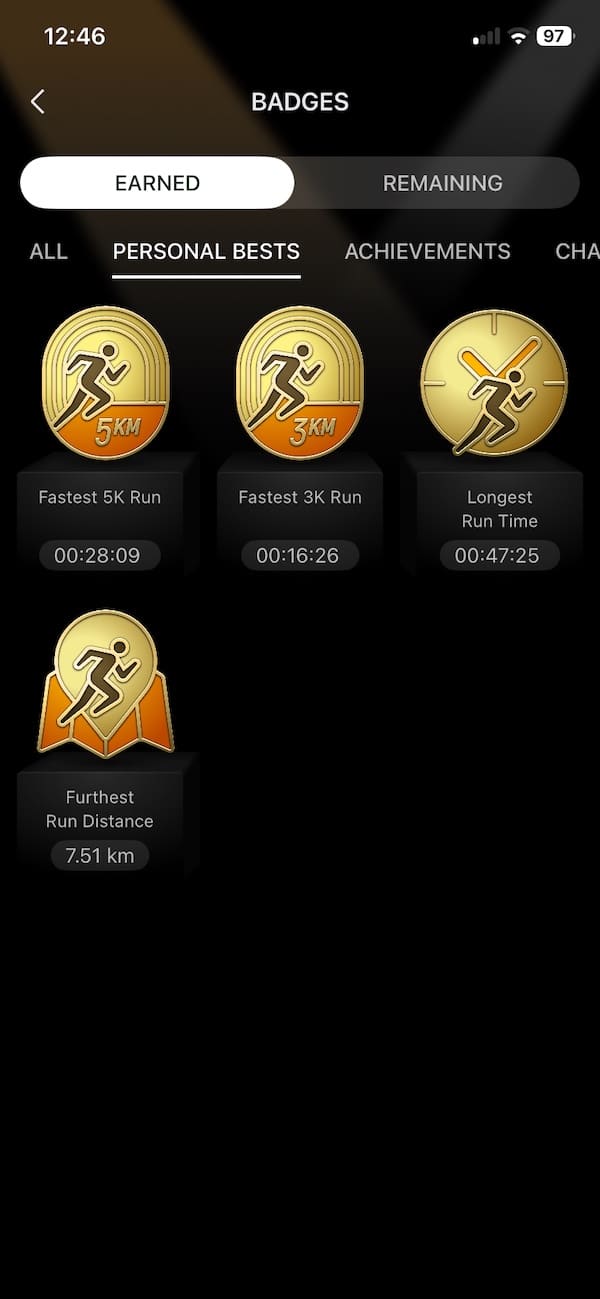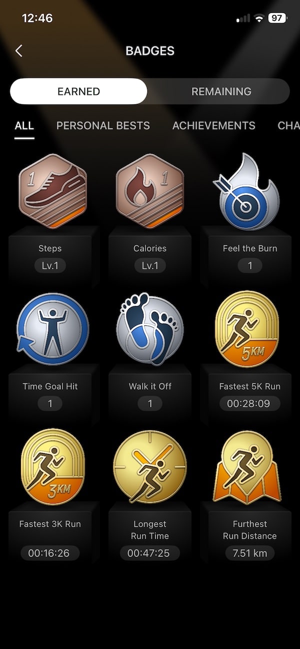 The app highlights your top efforts in each category. For example, there are badges for your fastest 3K and 5K runs, longest runs by time and distance, and perfect weeks for calories, steps and time spent in the fat burn zone.