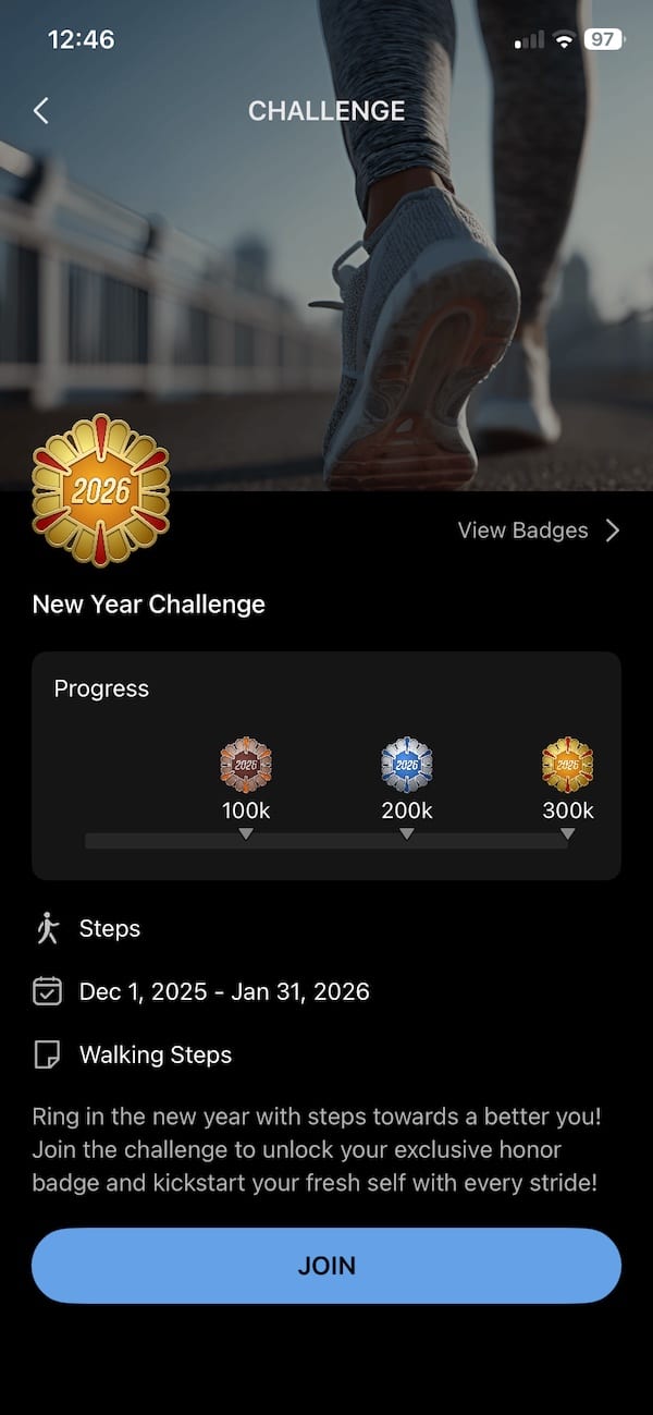 In the challenge section, you can join time-limited step events such as the current New Year Challenge which runs through the end of January. The badge design leans towards the visual style popularised by Apple, with colour-coded medals and animated progress bars.