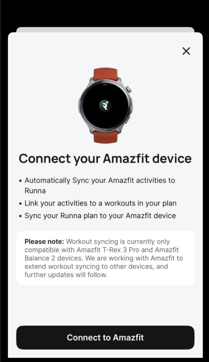 If you’re using a different Amazfit watch, syncing may still work partially through the Zepp app, but direct integration with Runna is being added device by device. A full list of supported watches is visible within the Zepp app under your training plan setup.
