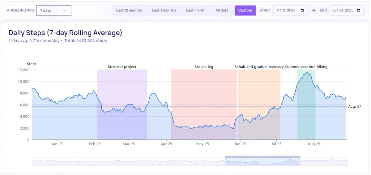 It handles steps, weight and sleep data, smoothing the results with rolling averages. The dashboard also highlights your averages and allows period comparison. You can use it to see what impact a stressful project had on your steps, how weight responded to a rehab period, or whether sleep improved after a shift in bedtime.