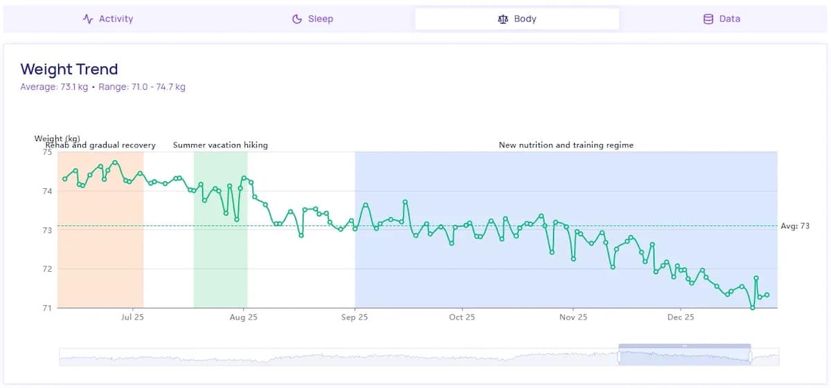 The difference is clear. Where Withings focuses on short-term summaries and calendar views, Heda stretches the timeline. You can scroll back months or even a full year to see how sleep, weight and activity evolved across different life phases. The interface adds support for event markers, so you can label periods like injury, vacation or new routines to give context to what changed and when.